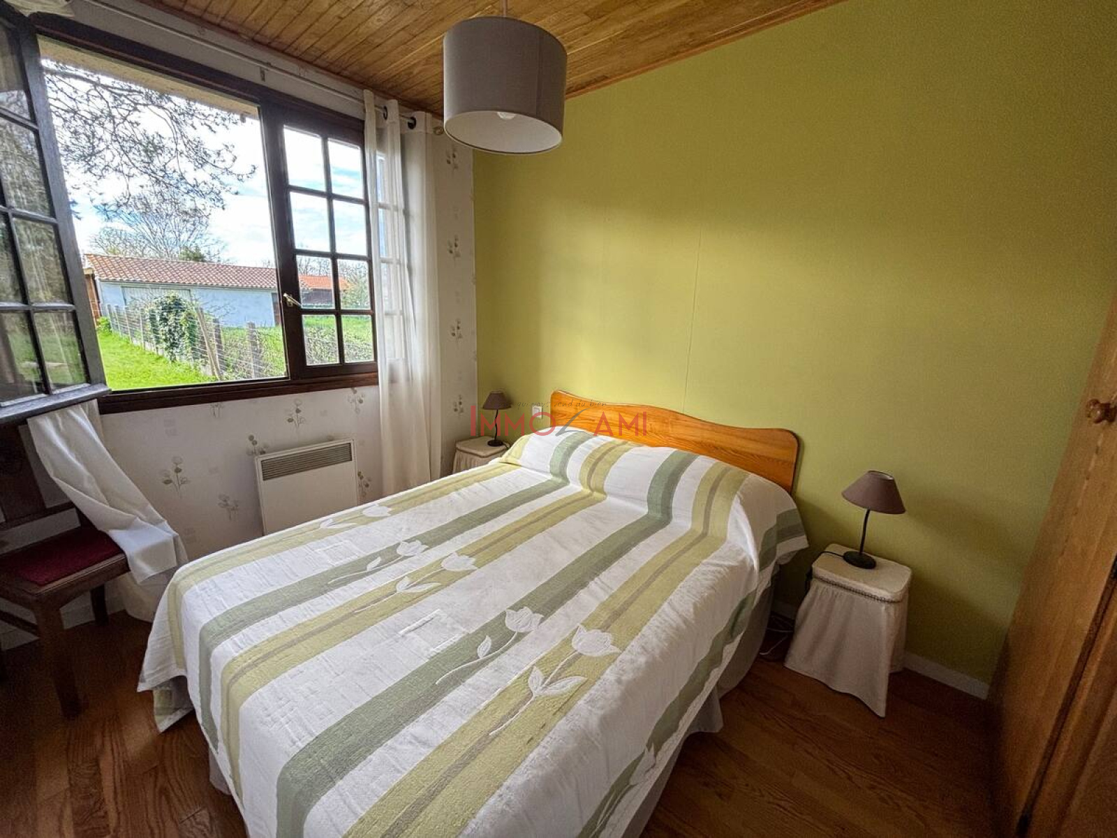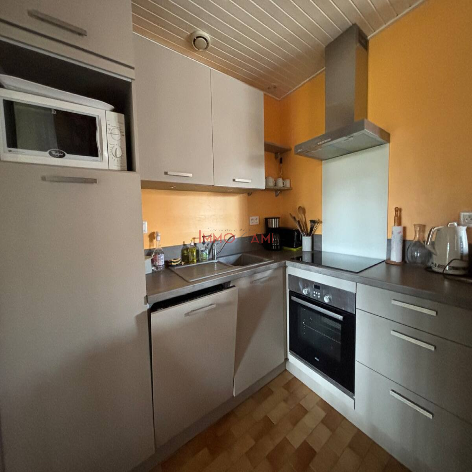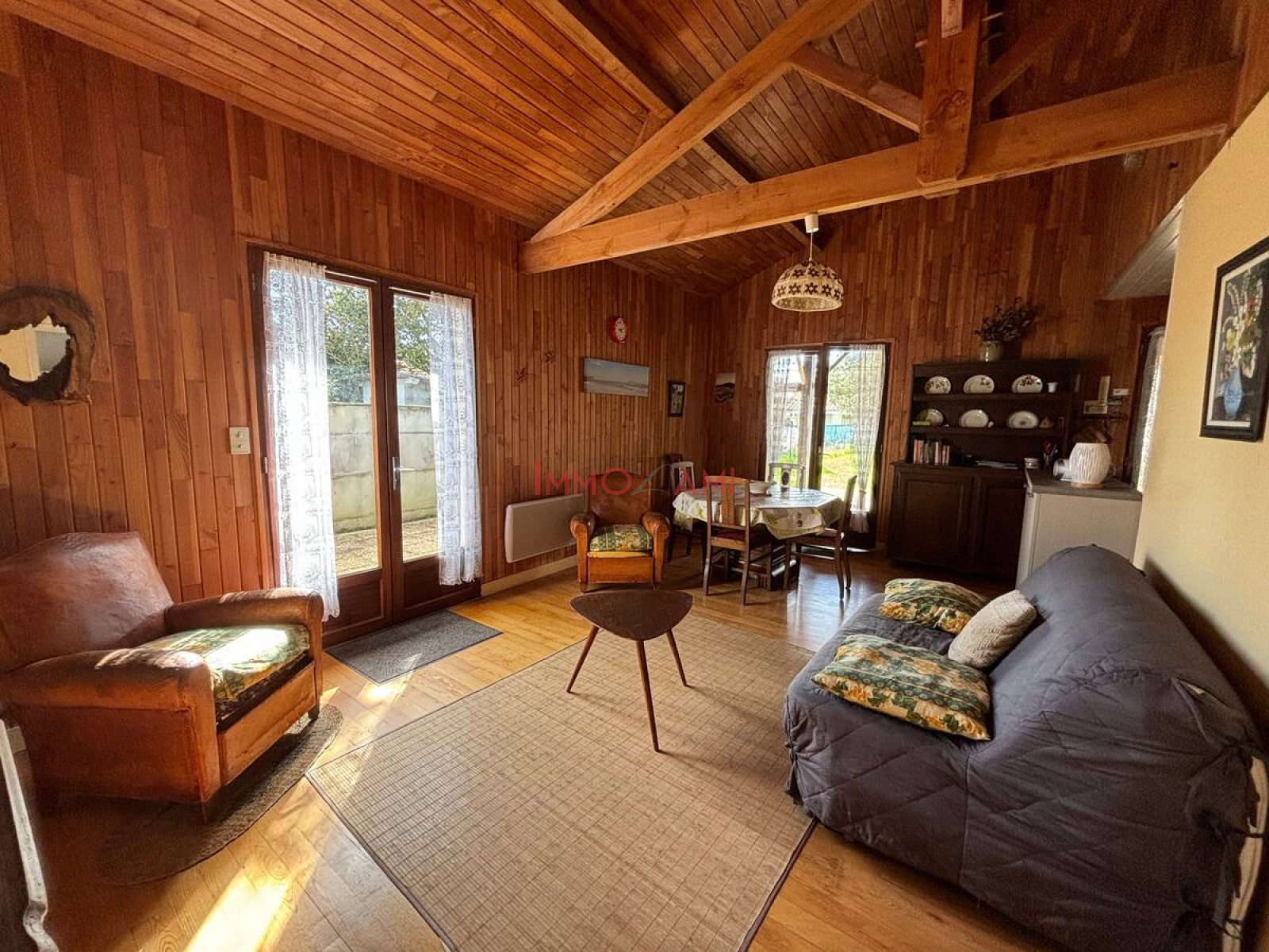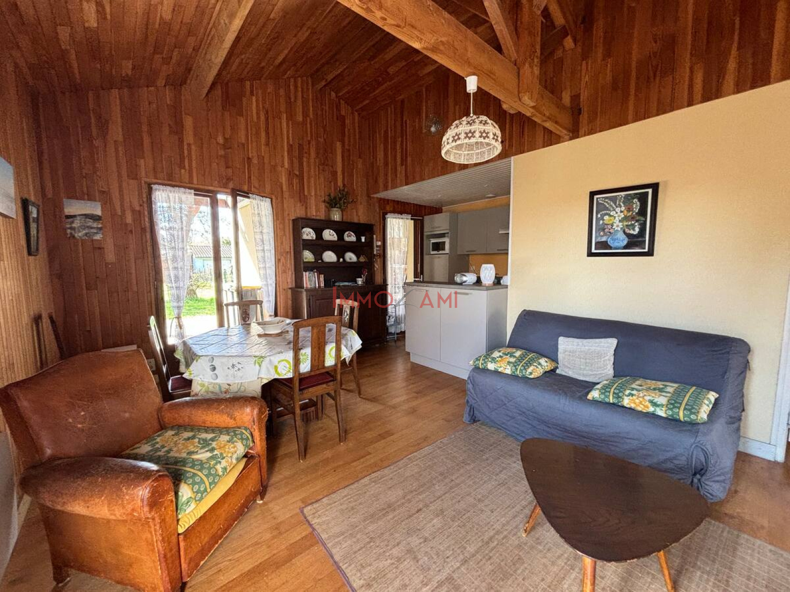 La cuisine ouverte est entièrement équipée, vous trouverez tout le nécessaire : plaques de cuisson, four, micro-ondes, réfrigérateur, ainsi qu'une multitude d'ustensiles et de vaisselle. La pièce de vie, adjacente à la cuisine, s'ouvre sur une terrasse abritée, offrant un cadre parfait pour des dîners en plein air, entouré d'un grand jardin.