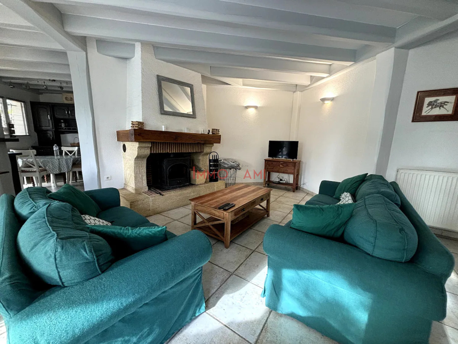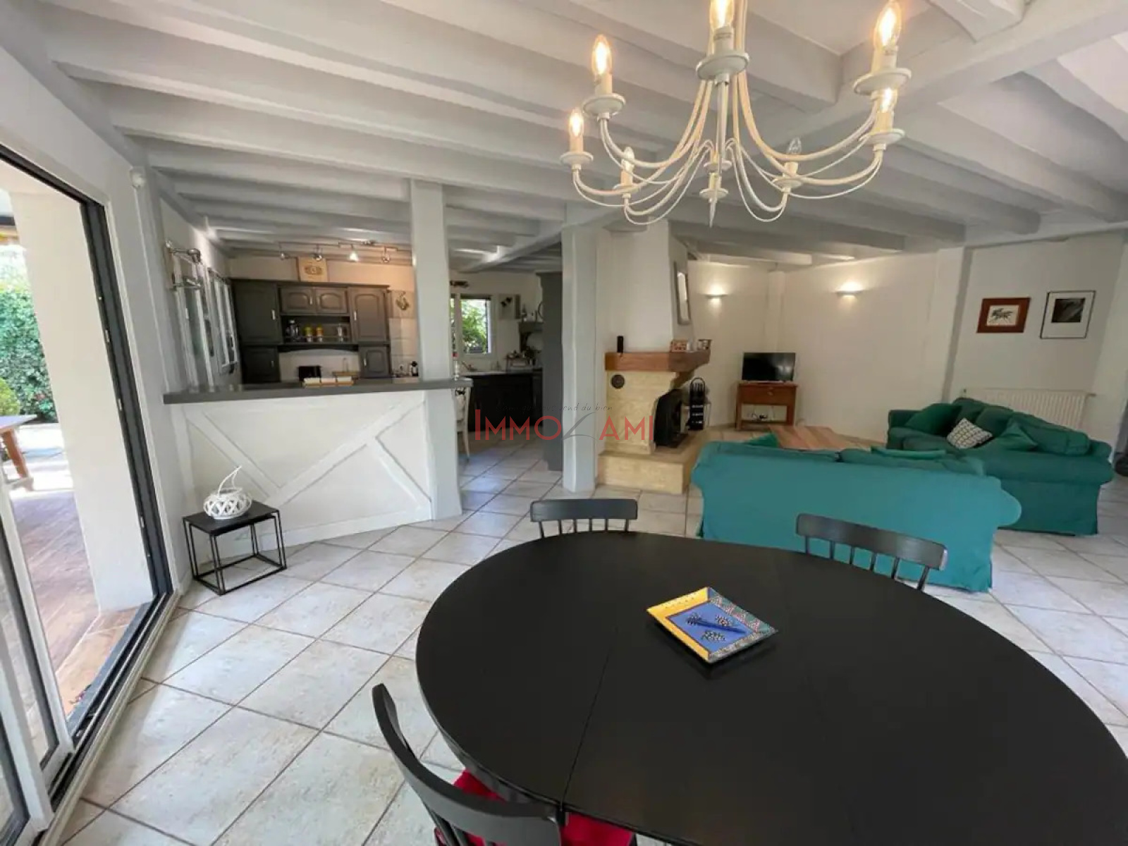 Le vaste séjour avec sa cheminée fonctionnelle est l'endroit parfait pour se retrouver, que ce soit pour des jeux en famille ou simplement se détendre. La cuisine entièrement équipée et la buanderie garantissent un séjour pratique pour tous les invités.