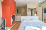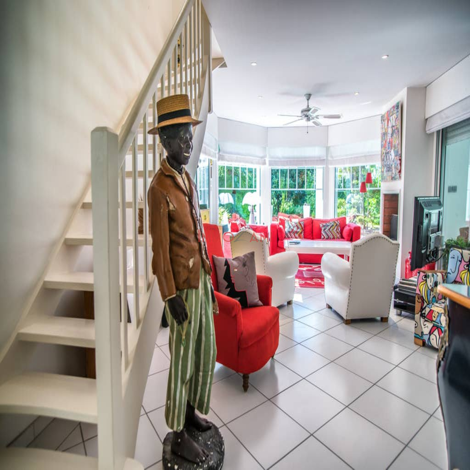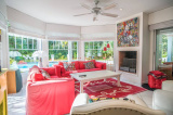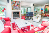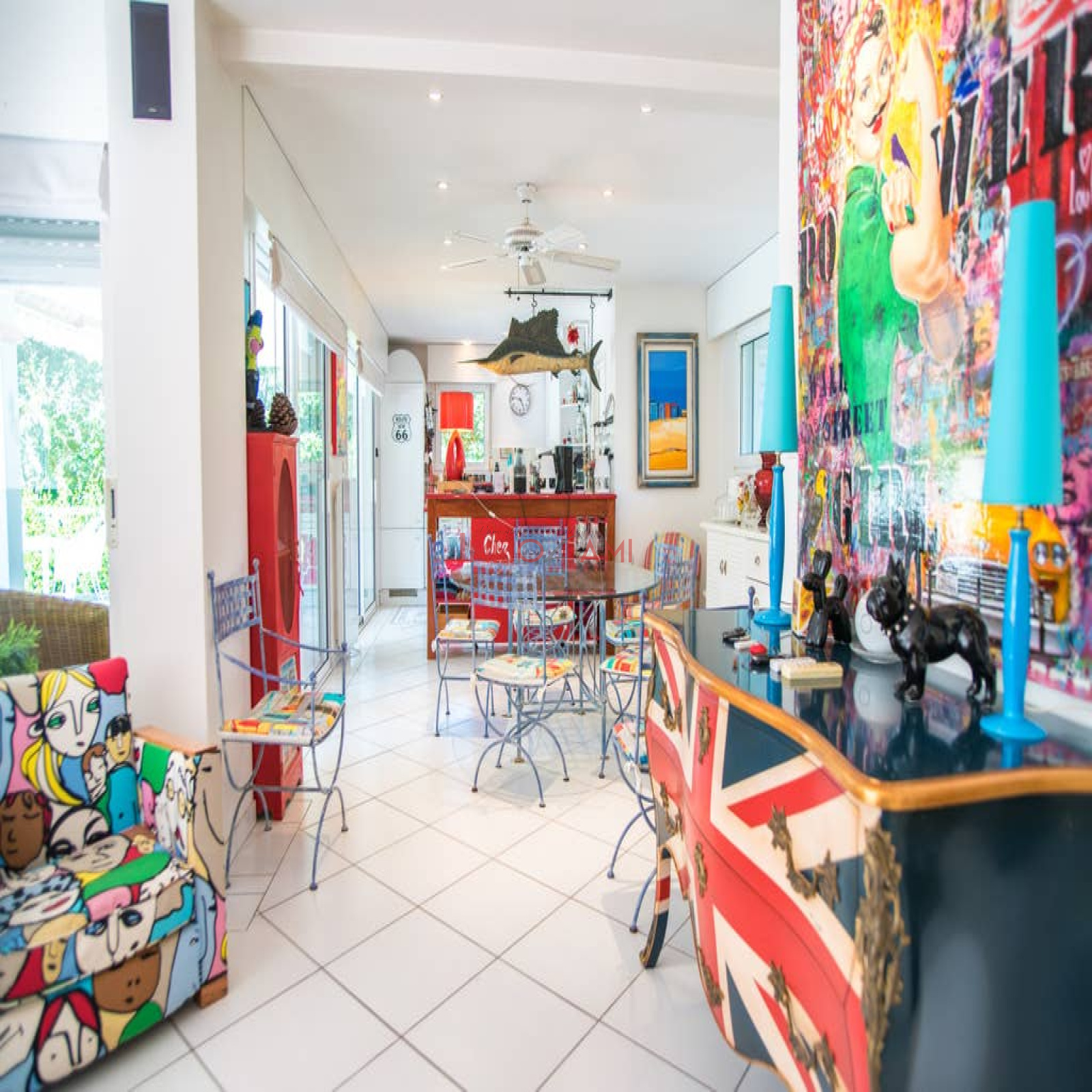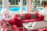 Au rez-de-chaussée, on a une vaste pièce à vivre très ouverte sur l'extérieur. Avec son juke-box et son canapé rouge, c'est un espace résolument moderne, heureux, lumineux.On prépare les repas dans la cuisine fleurie puis on va s'installer sur la table transparente de la salle à manger ou sur les bancs de la terrasse couverte. On s'allonge sur le canapé devant la télévision ou on préfère lire sur les fauteuils du salon extérieur. Le soir, après le dîner, on regarde les étoiles sur un transat près de la piscine.. Chacun vit ici à son rythme et au gré de ses envies.