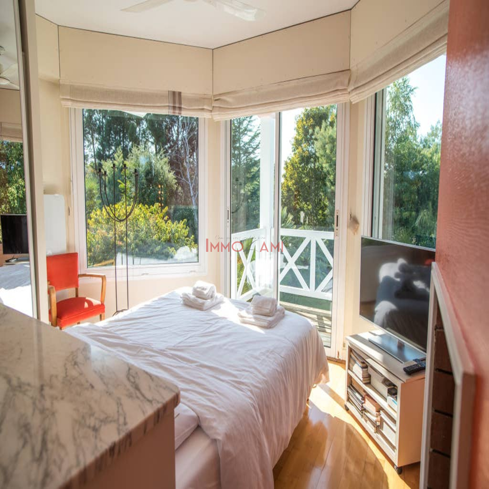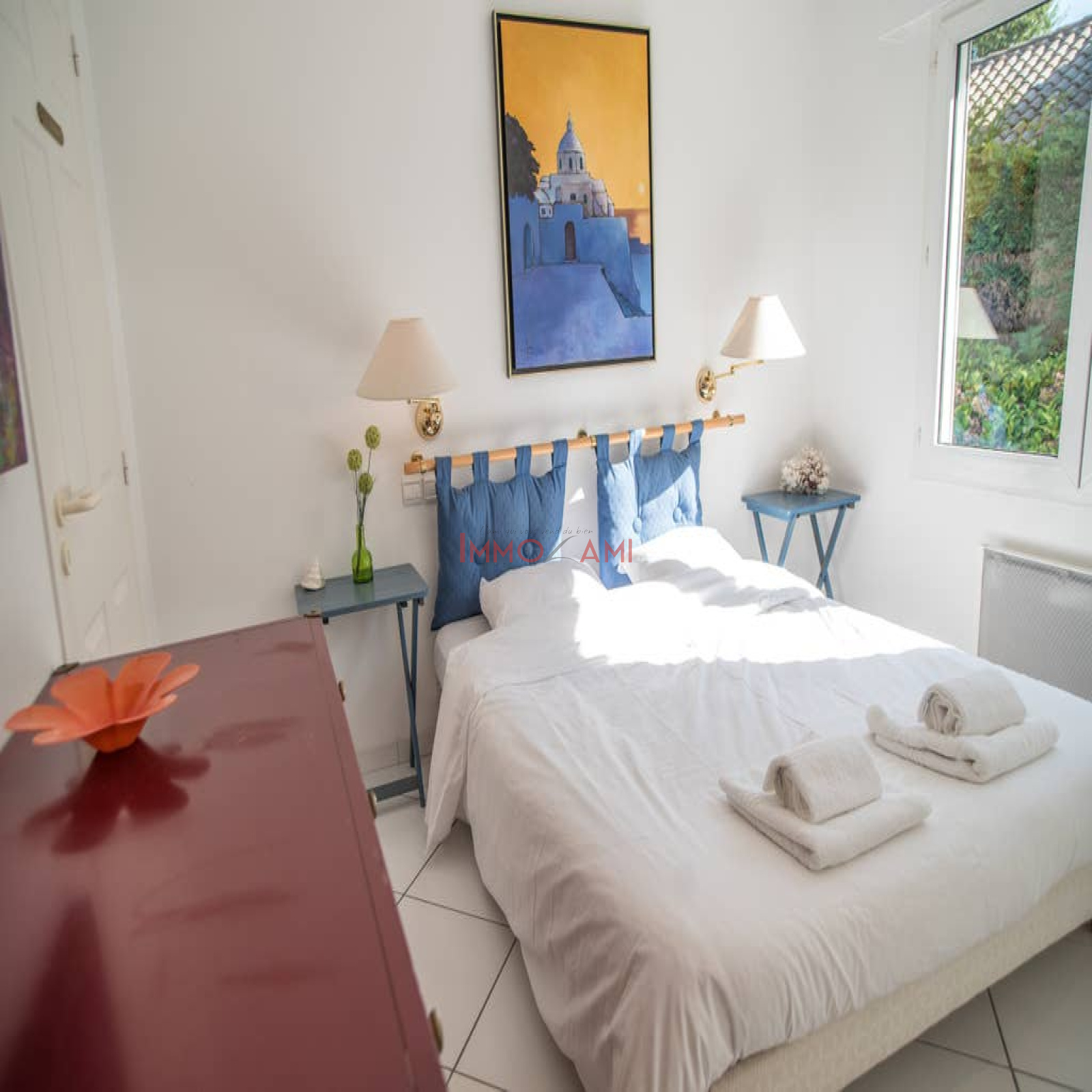 Pour la partie nuit : On a deux chambres doubles au rez-de-chaussée, avec lits queen size et salles d'eau en suite. A l'étage se trouvent la suite paretnale avec un petit balcon surplombant la piscine et le golf, avec salle de bain, et une chambre d'enfants avec lits superposés et salle d'eau attenante.
