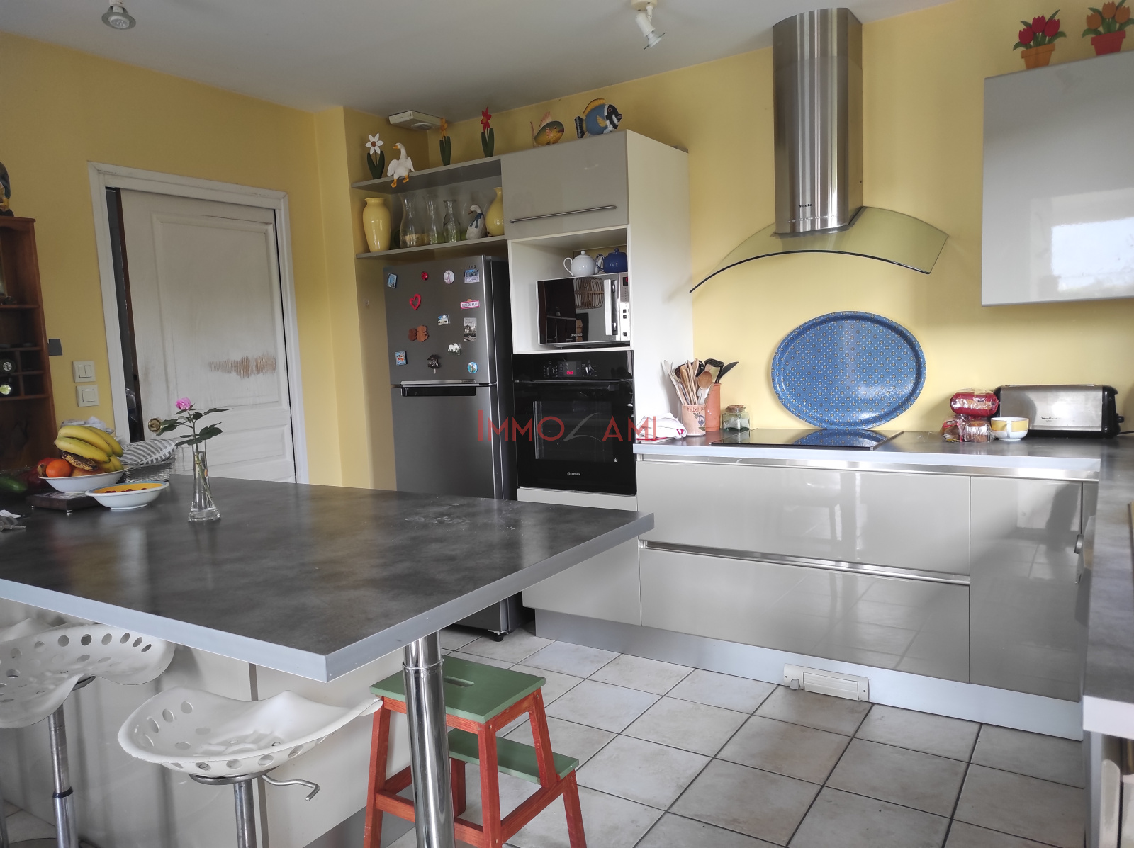 Dès votre arrivée, une entrée accueillante vous conduit vers un séjour lumineux, véritable cœur de la maison. La cuisine ouverte, entièrement équipée, favorise convivialité et partage. Un garage attenant et une buanderie offrent des espaces de rangement et de praticité au quotidien.