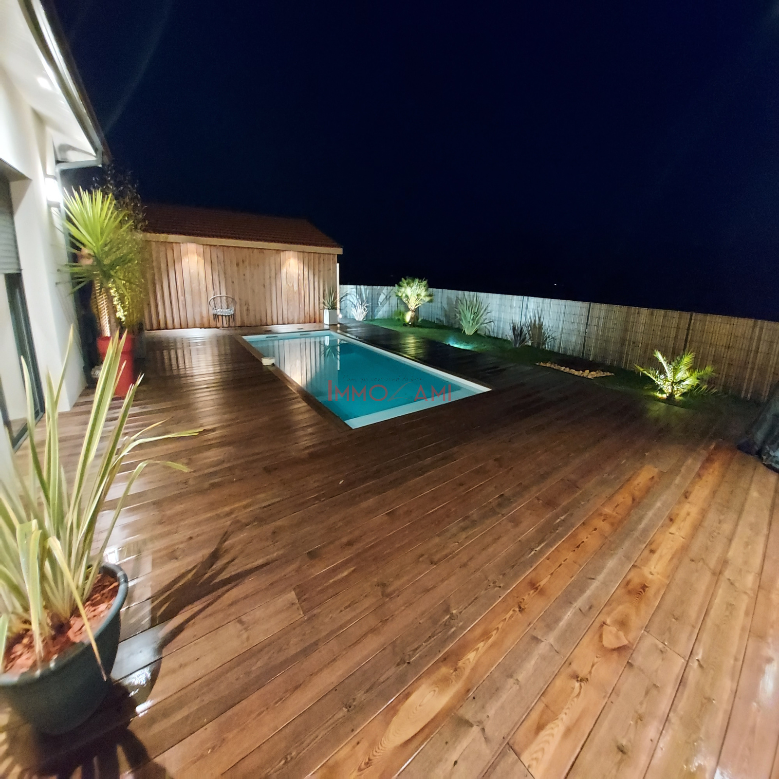 A l'extérieur, vous trouverez une piscine au sel avec son pool-house sur une terrrasse bois de plus de 100 mètres carrés ainsi qu'un jardin entièrement paysagé avec arrosage intégré et éclairage.