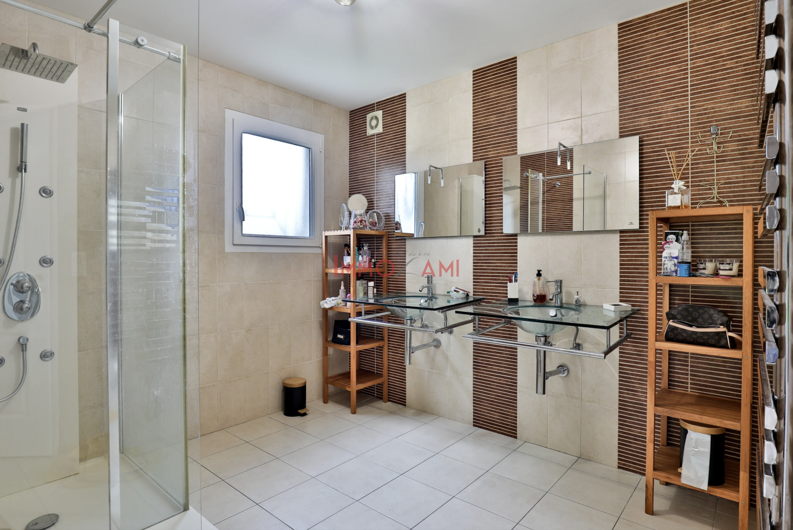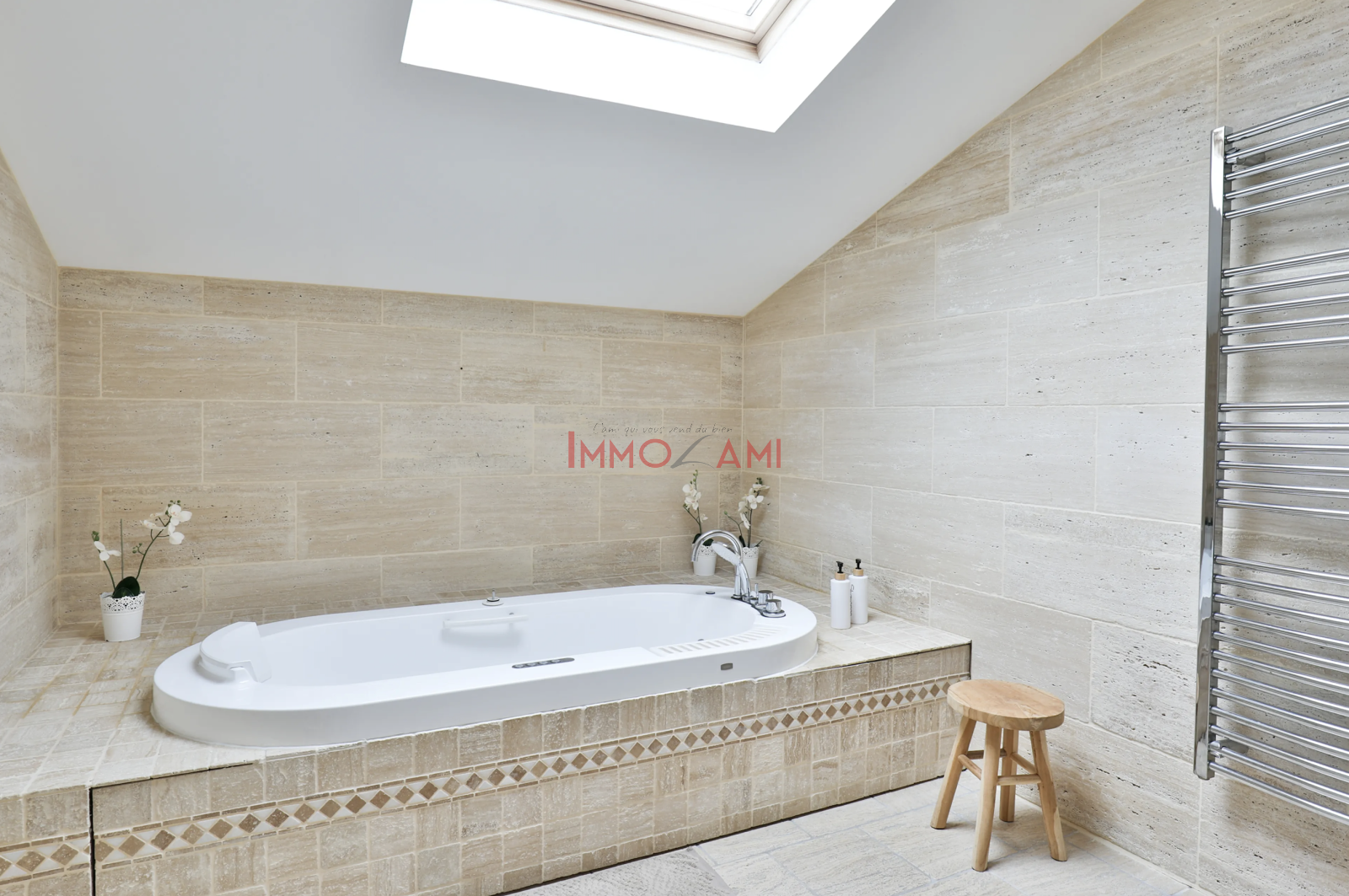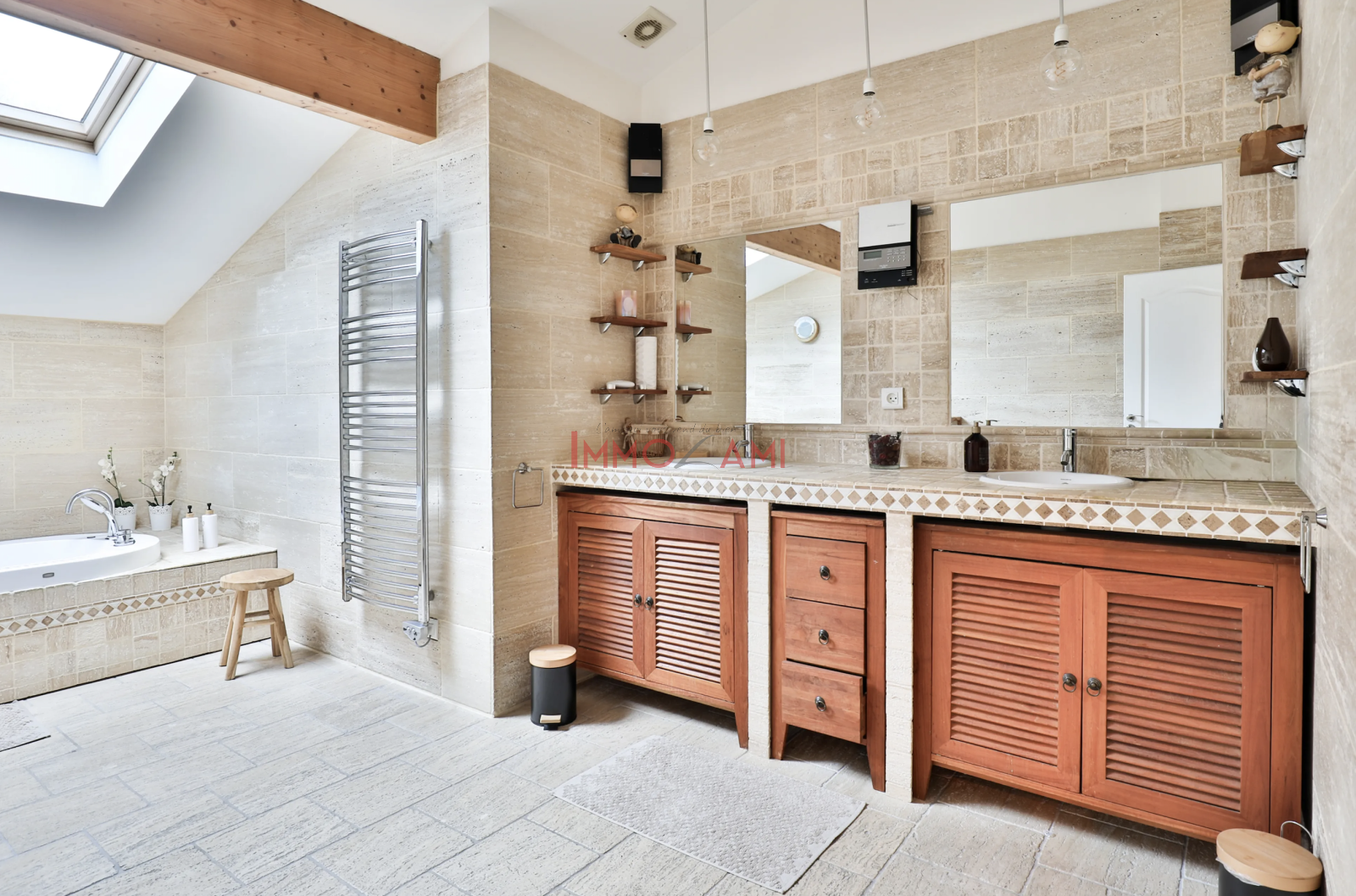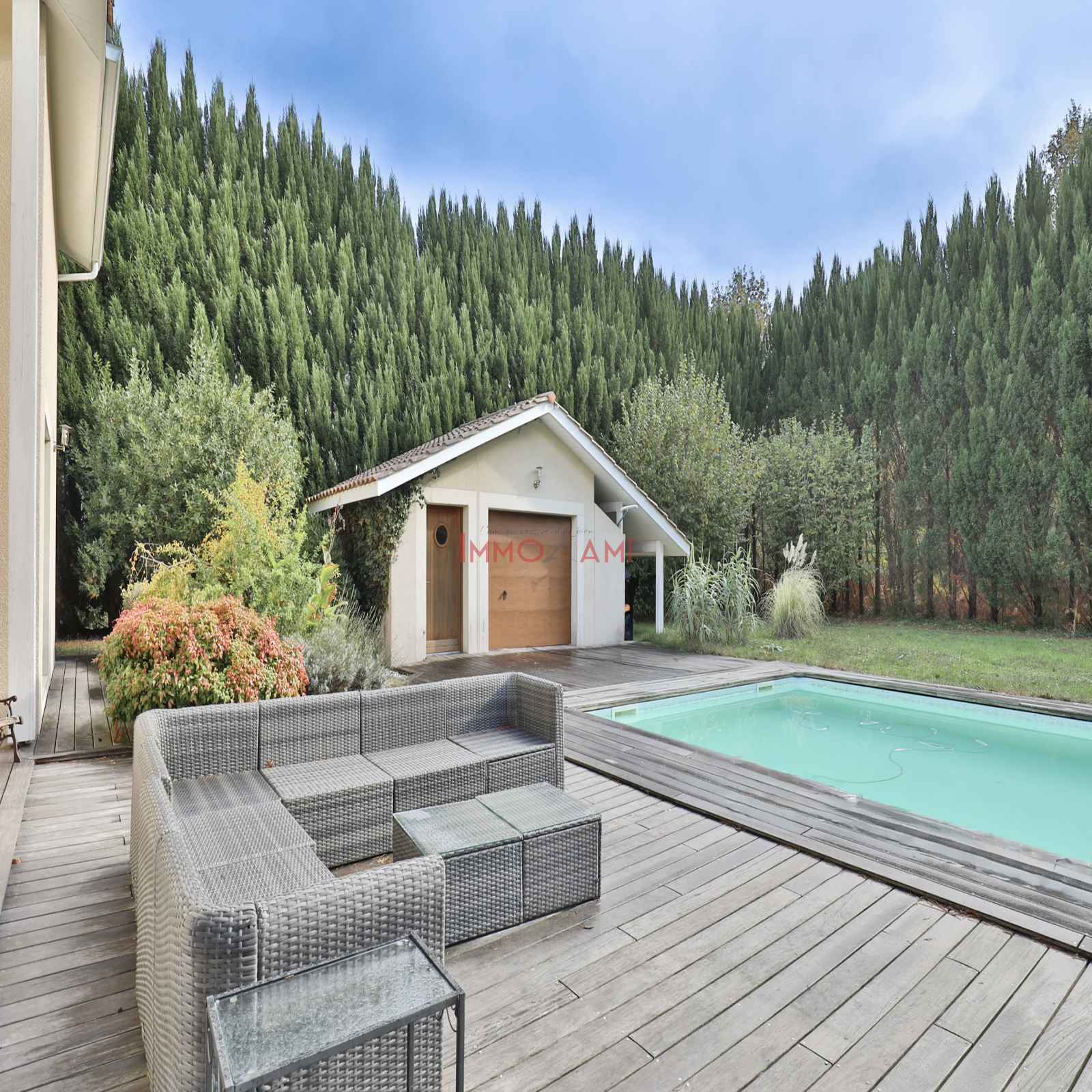 Dès l’entrée, vous serez séduit par le vaste séjour cathédrale d’environ 65 m², baigné de lumière et ouvert sur la terrasse bois et la piscine.